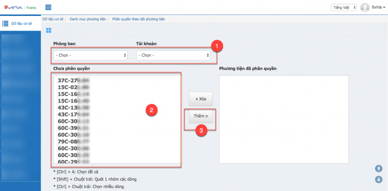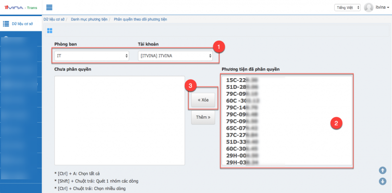 Chọn phòng ban và tài khoản người dùng muốn thay đổi quyền xem phương tiện (1) -> Nhấn chọn vào 1 phương tiện hoặc nhấn giữ phím shift đồng thời nhấn chọn cùng lúc nhiều phương tiện ở vùng (2) -> Nhấn “Xoá” (3):