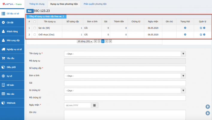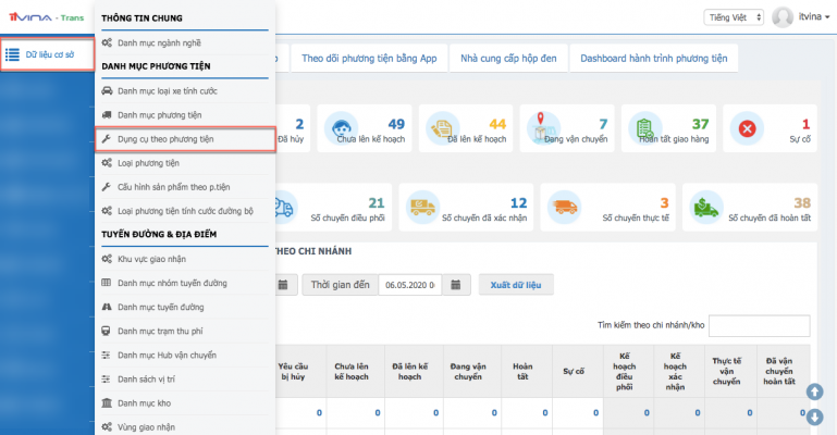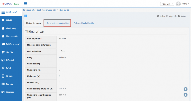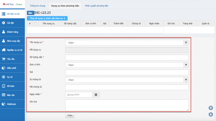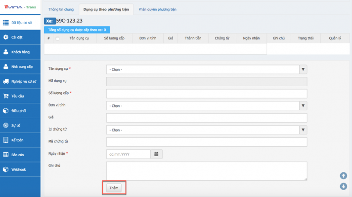 Tại phân hệ Transport, vào “Dữ liệu cơ sở” -> “Dụng cụ theo phương tiện”:
