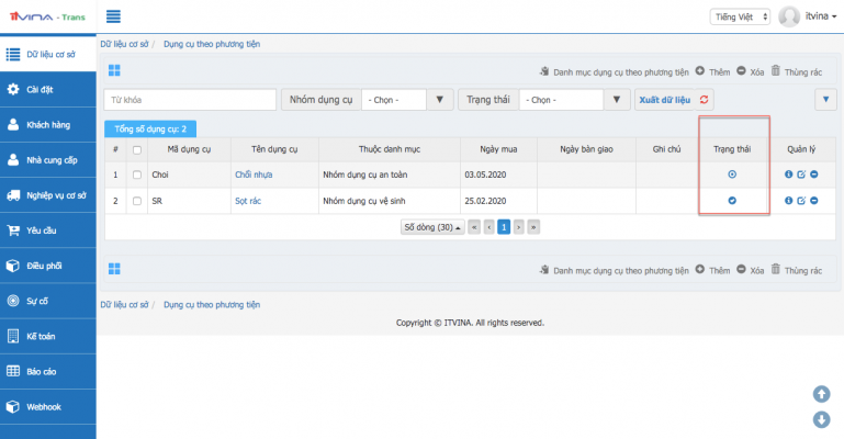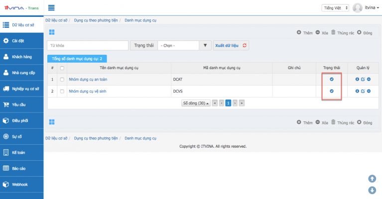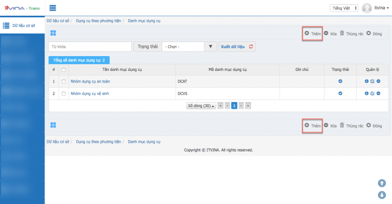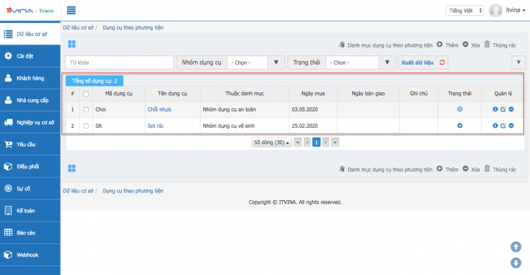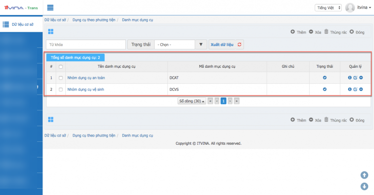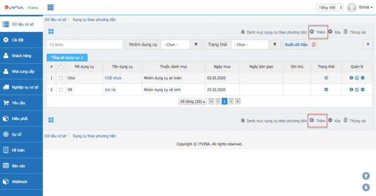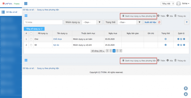 Tại màn hình danh mục dụng cụ theo phương tiện, bạn sẽ nhìn thấy danh sách các nhóm phương tiện đã thêm vào phần mềm trước đó hiển thị: