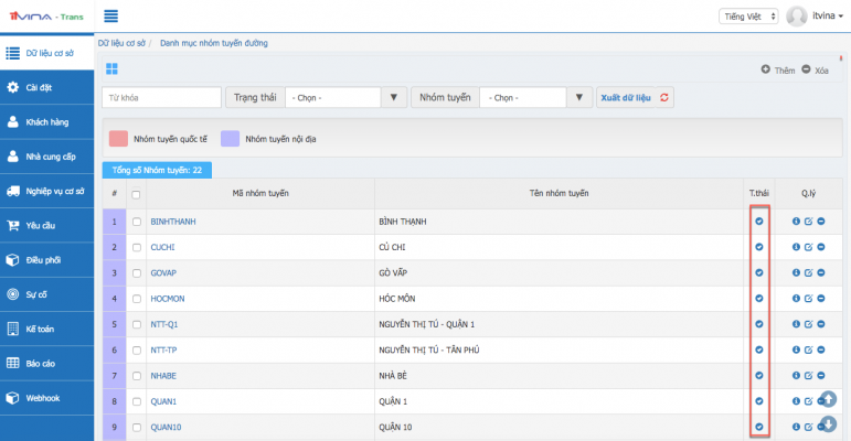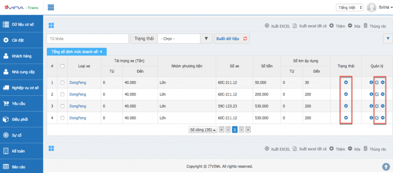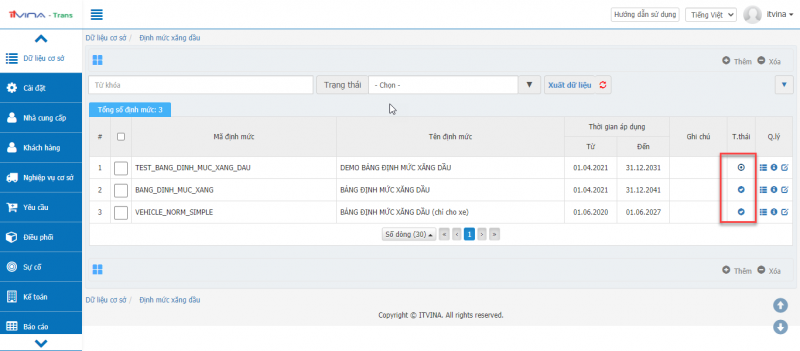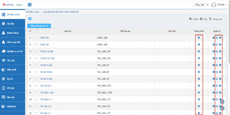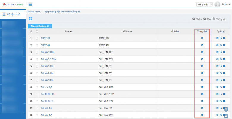 3.5. Kích hoạt (sử dụng) và vô hiệu (không sử dụng) loại phương tiện tính cước đường bộ đã thêm: