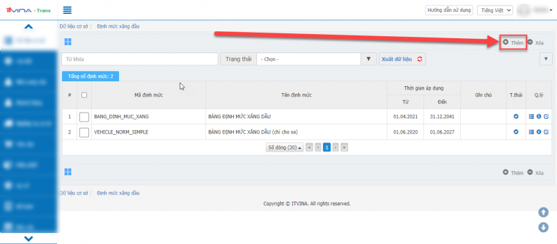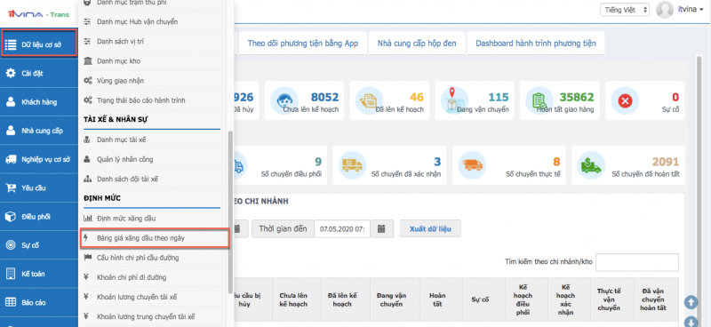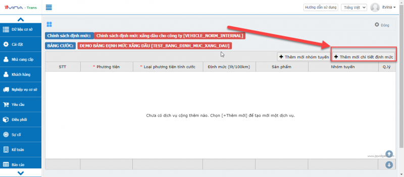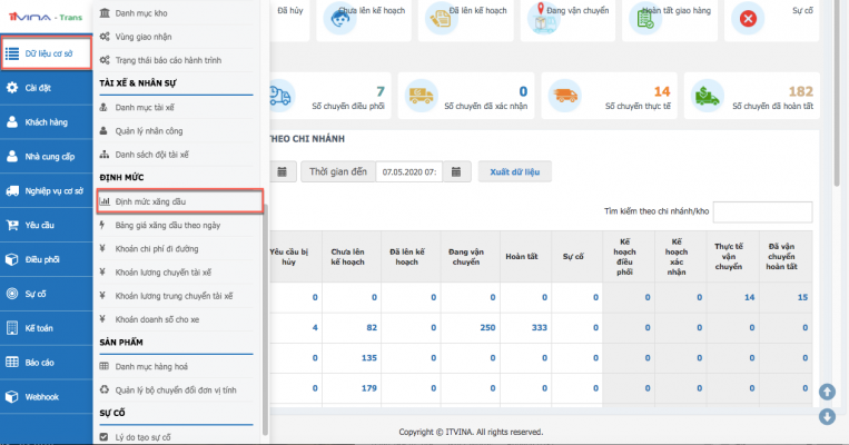 - Tại phân hệ Transport, vào “Dữ liệu cơ sở” -> ”Định mức xăng dầu”: