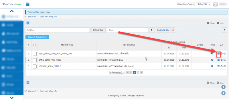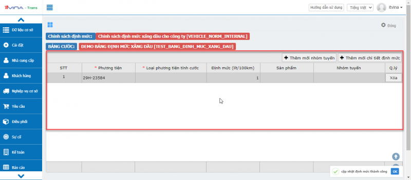 Khi thêm mới phương tiện và định mức, phần mềm tự động lưu lại dữ liệu.