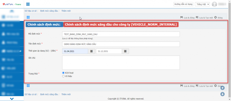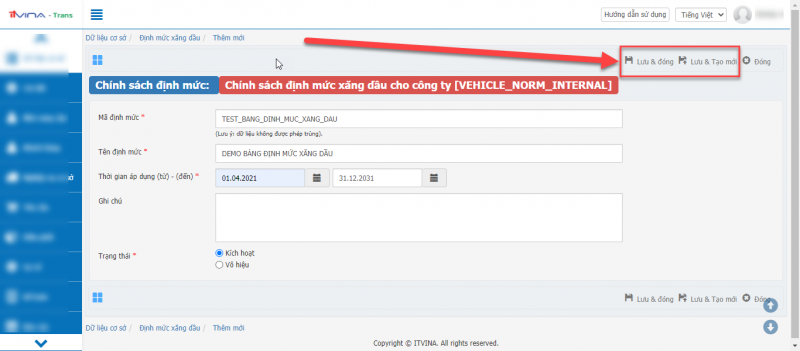 Nhập thông tin cài đặt khoán cho xe -> Nhấn “Lưu & đóng” hoặc “Lưu & tạo mới”: