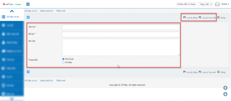 Nhập thông tin lot -> Nhấn “Lưu & đóng” hoặc “Lưu & tạo mới”: