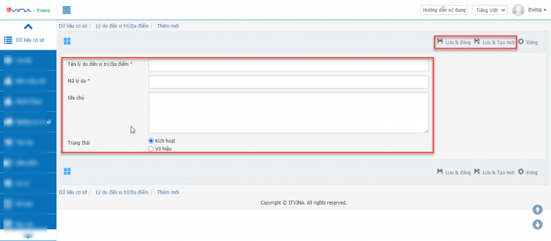 Nhập thông tin Lý do đến vị trí/địa điểm-> Nhấn “Lưu & đóng” hoặc “Lưu & tạo mới”: