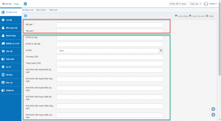 Nhập thông tin Bồn (Tank), các trường đóng khung đỏ là bắt buộc, các trường đóng khung xanh -> Nhấn “Lưu & đóng” hoặc “Lưu & tạo mới”.