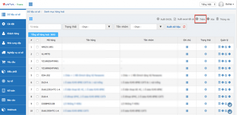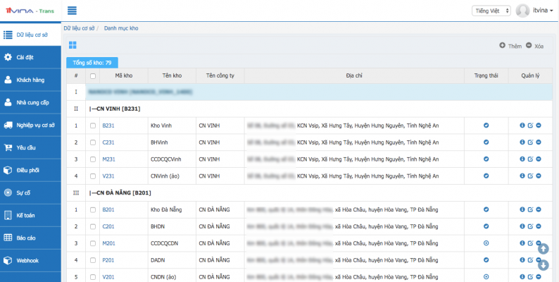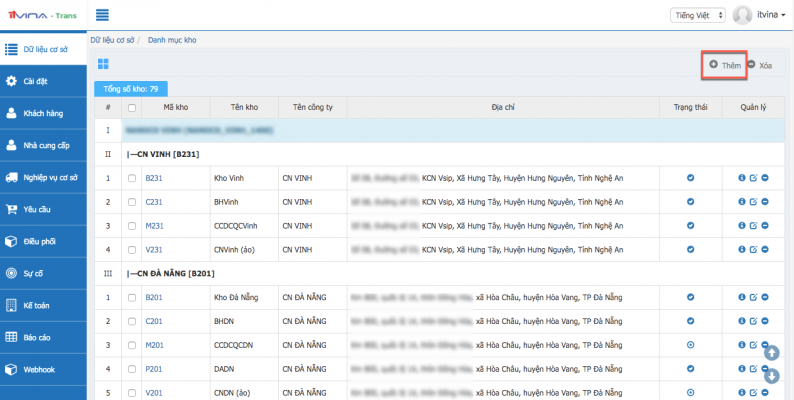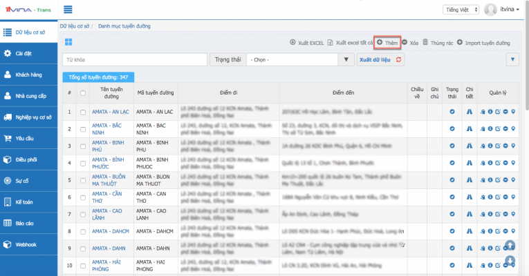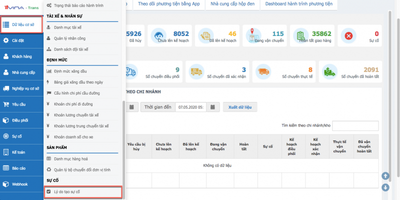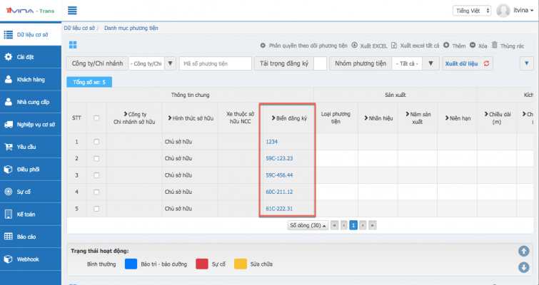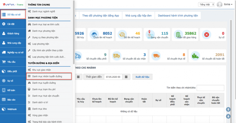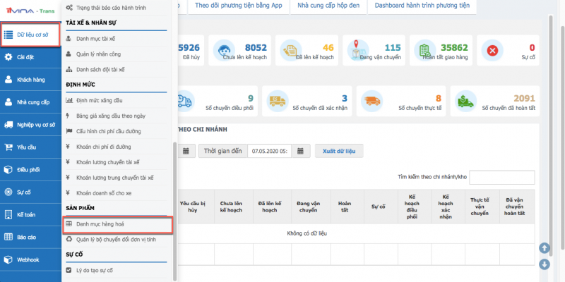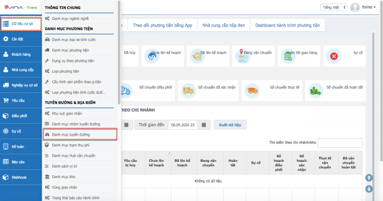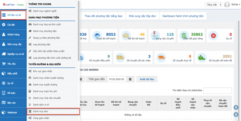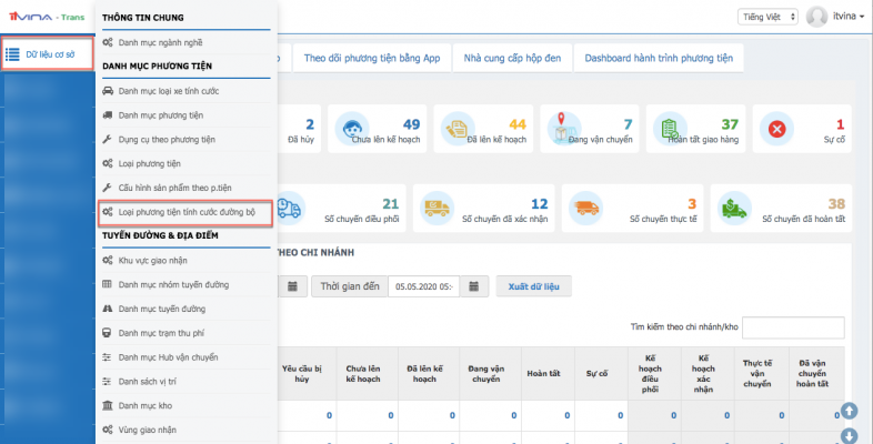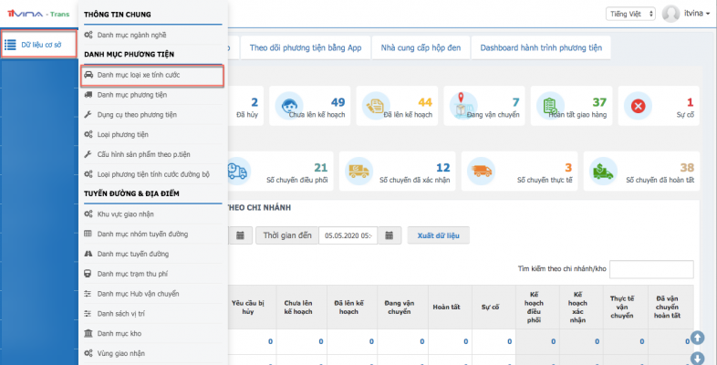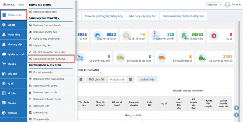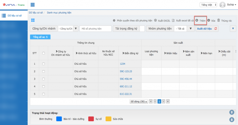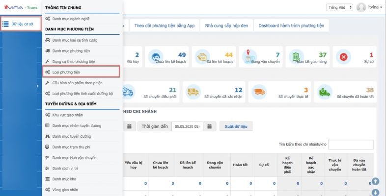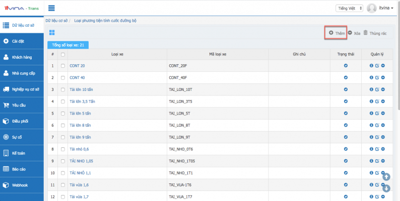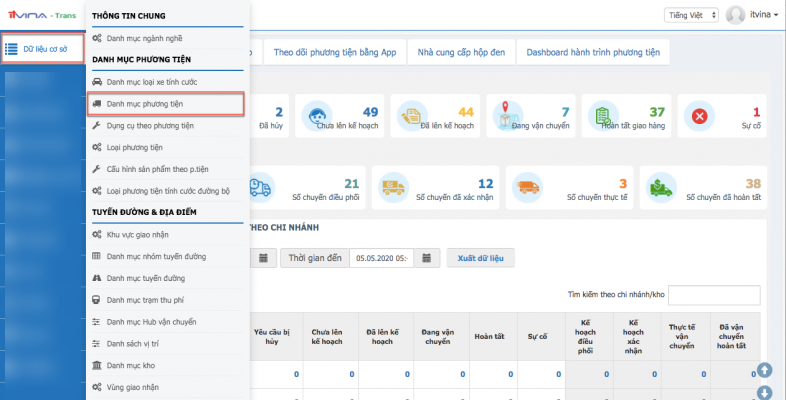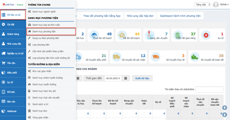 Tại phân hệ Transport, vào “Dữ liệu cơ sở” -> “Danh mục phương tiện”: