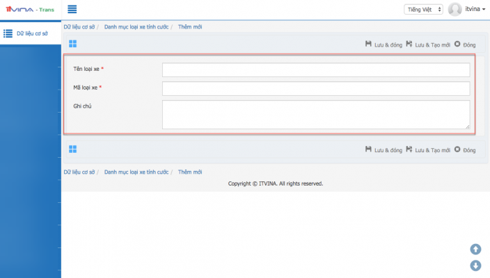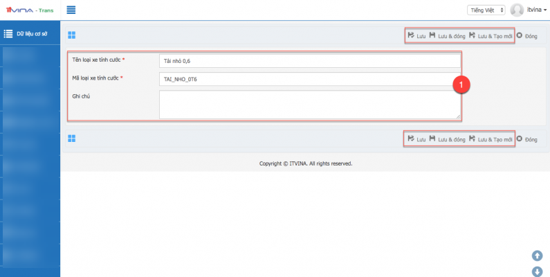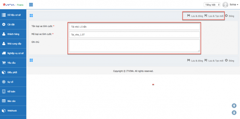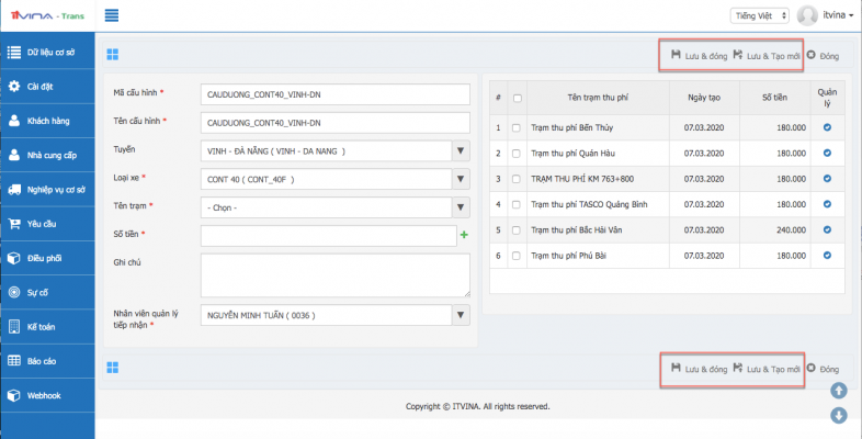 Nhập thông tin loại xe tính phí cầu đường -> Nhấn “Lưu & đóng” hoặc “Lưu & tạo mới”: