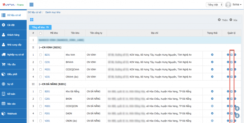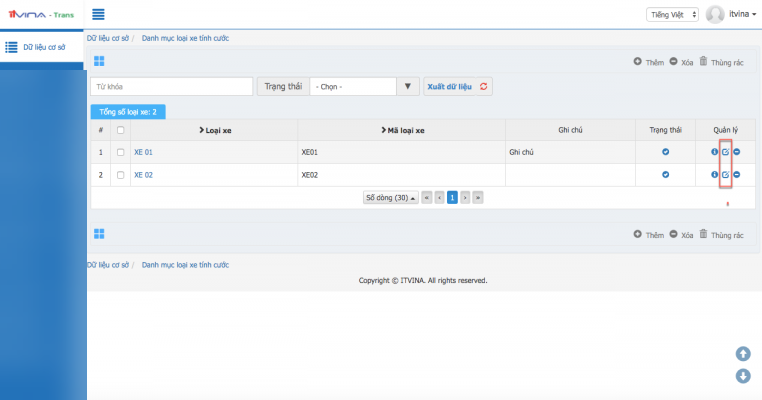 Tại màn hình xem danh sách loại phương tiện đã thêm, nhấn chức năng sửa ứng với loại phương tiện muốn sửa thông tin: