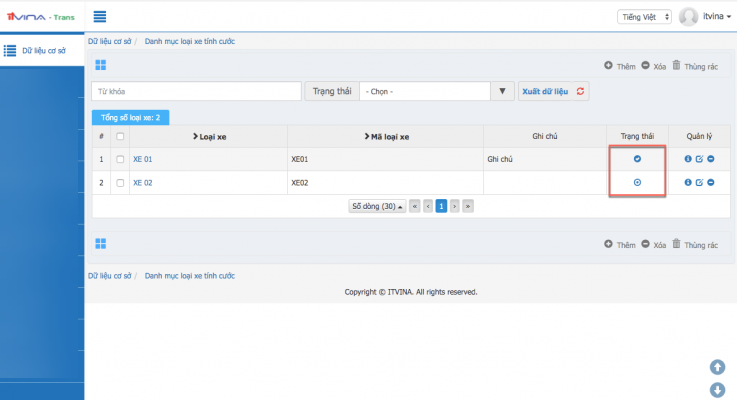 Tại màn hình xem danh sách các loại xe tính cước đã thêm, đối với các loại xe tính cước không còn sử dụng đến nữa, bạn có thể sử dụng chức năng vô hiệu các loại xe tính cước này bằng cách nhấn vào icon (