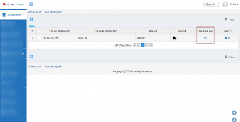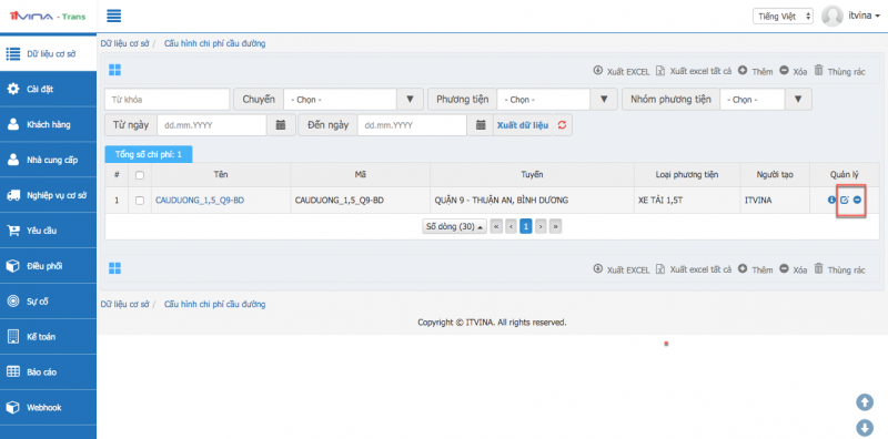3.3. Xoá loại phương tiện tính cước đường bộ đã thêm: