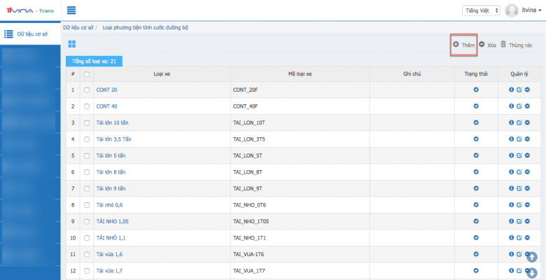 3.1. Xem danh sách các loại phương tiện tính cước đường bộ đã thêm: