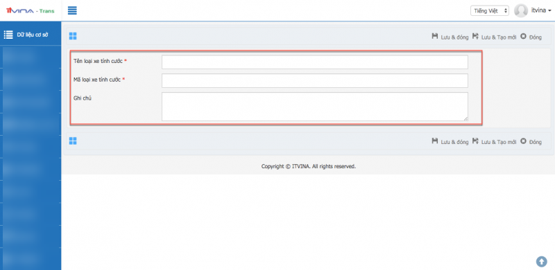 Tại phân hệ Transport, vào “Dữ liệu cơ sở” -> “Danh mục loại xe tính cước”: