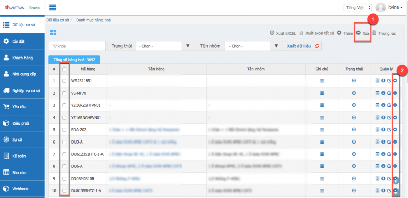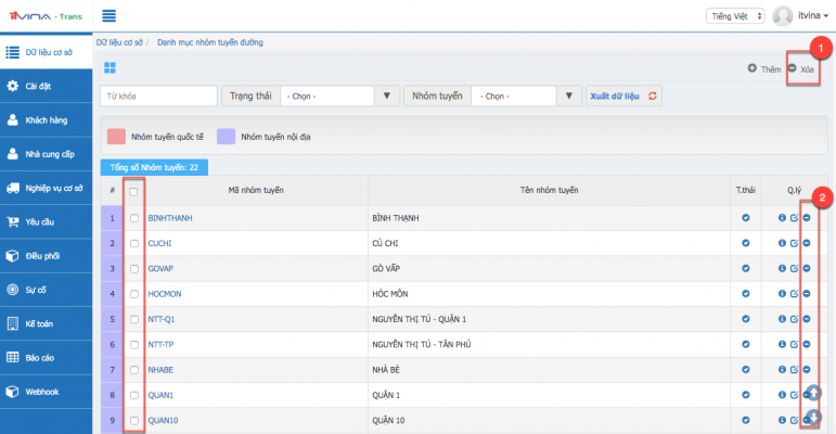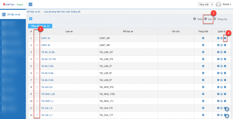 Tại màn hình xem danh sách các loại xe tính cước đã thêm, tick chọn hàng loạt các loại xe tính cước muốn xoá và nhấn chức năng xoá hàng loạt ở vị trí (1) hoặc nhấn vào chức năng xoá từng loại xe tính cước ở vị trí (2):