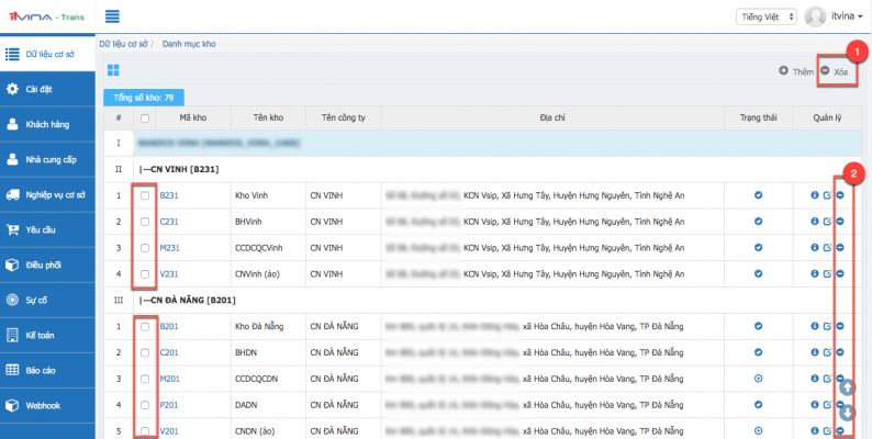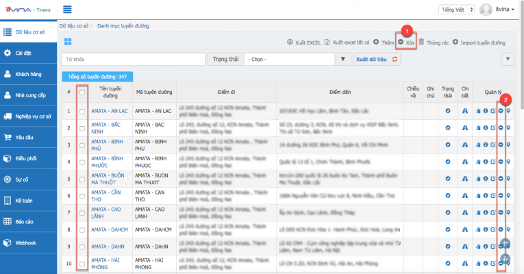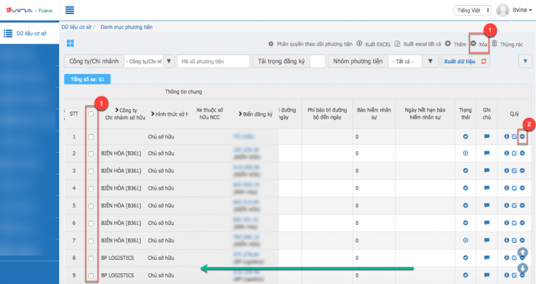 Tại màn hình xem danh sách các phương tiện đã thêm, tick chọn hàng loạt phương tiện muốn xoá và nhấn chức năng xoá hàng loạt ở vị trí (1) hoặc nhấn vào chức năng xoá từng phương tiện ở vị trí (2):