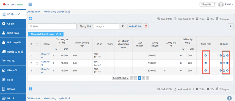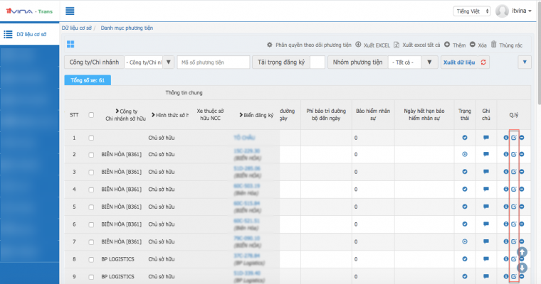 Mục đích: Dùng để quản lý danh sách các phương tiện vận chuyển (xe, sà lan) của Công ty bạn.