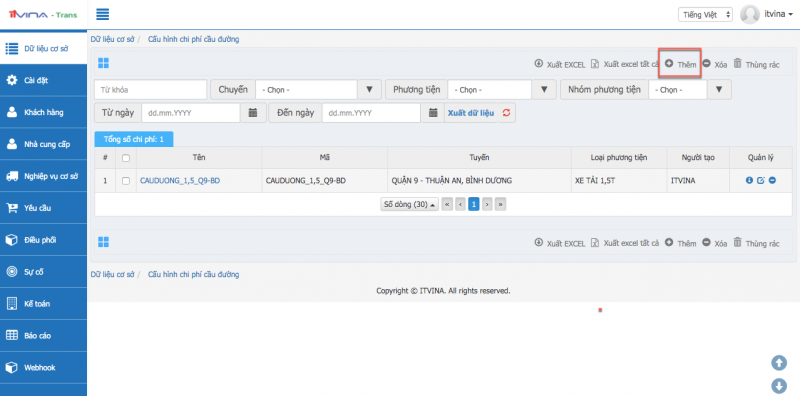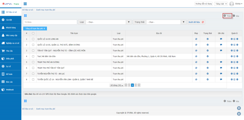 Mục đích: Dùng để cài đặt danh sách các trạm thu phí ở khu vực các tuyến đường mà phương tiện vận chuyển đi qua. Mặc định phần mềm sẽ được cài đặt sẵn danh sách các trạm thu phí cơ bản, bạn có thể cài thêm khi có phát sinh mới hoặc thấy thiếu.