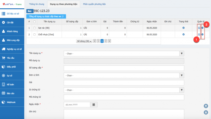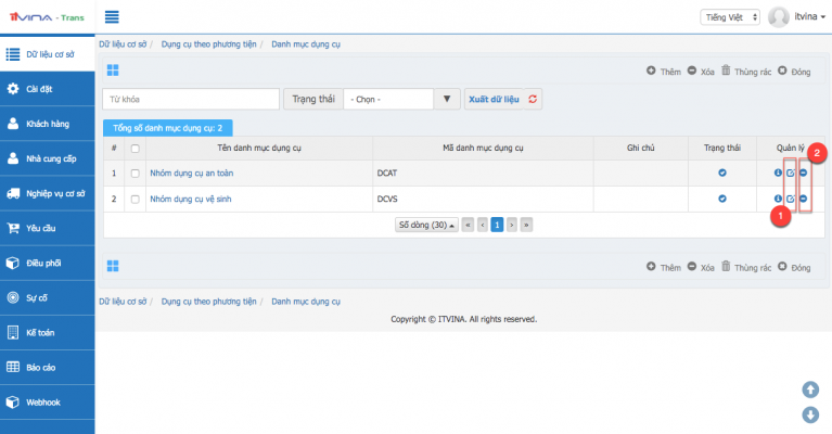 Để xoá/ sửa thông tin nhóm dụng cụ đã thêm trước đó, tại màn hình xem danh sách nhóm dụng cụ đã thêm, bạn nhấn vào chức năng xoá hoặc sử tương ứng với nhóm dụng cụ muốn xoá (2) hoặc muốn sửa (1):