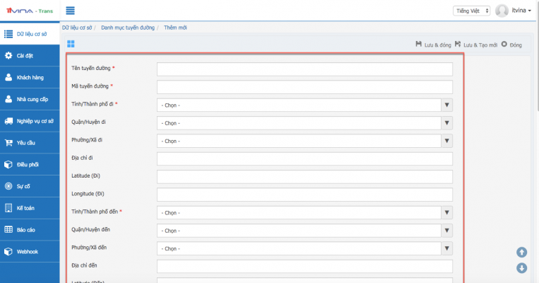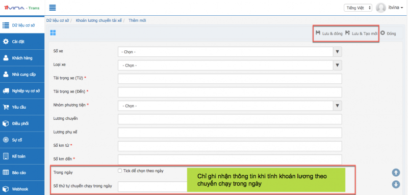 Nhập thông tin cấu hình lương khoán ứng với từng xe hoặc từng nhóm xe -> Nhấn “Lưu & đóng” hoặc “Lưu & tạo mới”: