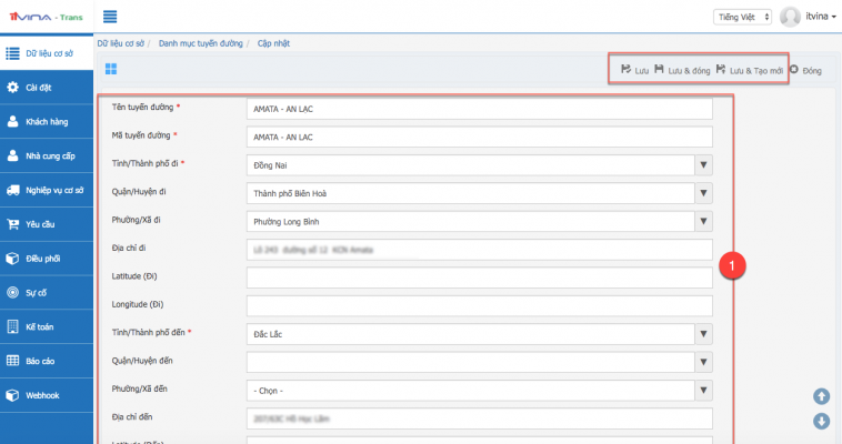Sửa thông tin (tại vùng 1) -> Nhấn “Lưu & đóng” hoặc “Lưu & tạo mới”: