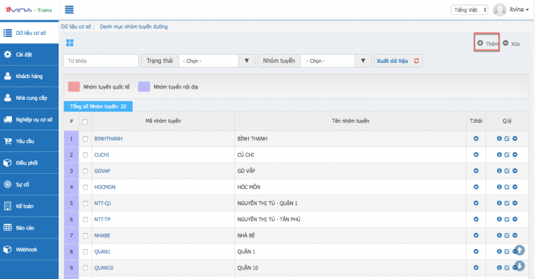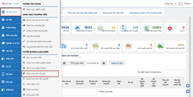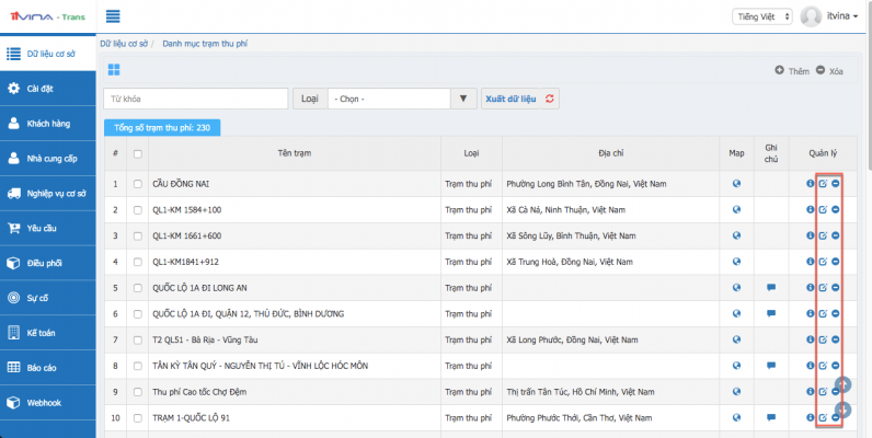 Tại phân hệ Transport, vào “Dữ liệu cơ sở” -> “Danh mục trạm thu phí”: