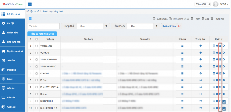 12.2. Xoá, sửa cấu hình sản phẩm theo phương tiện đã tạo trước đó:
