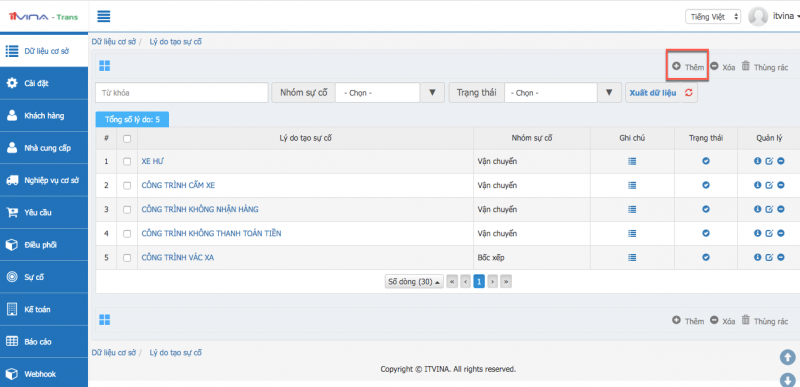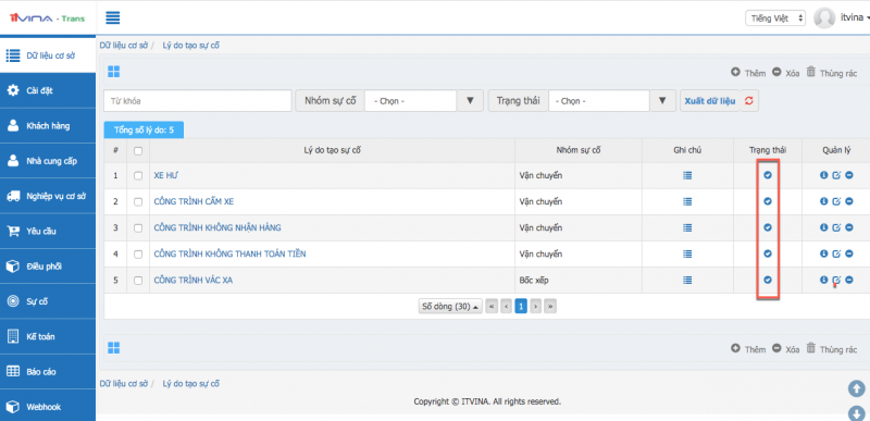 11.4. Kích hoạt (sử dụng) và vô hiệu (không sử dụng ) lý do sự cố đã thêm: