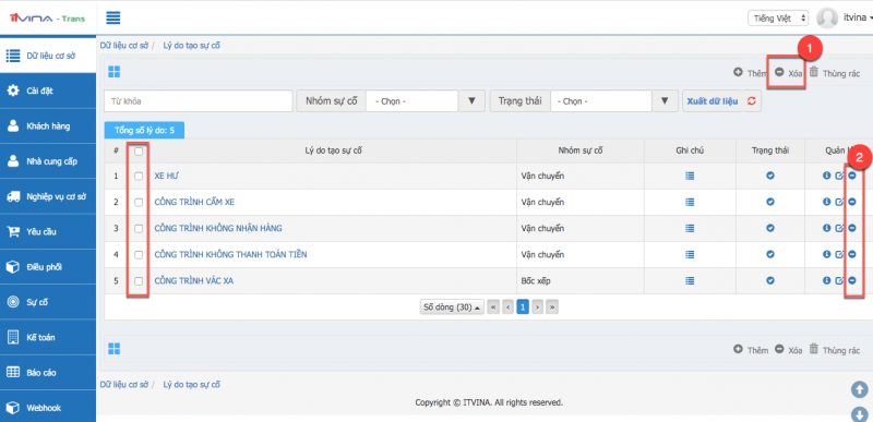 Để xoá lý do sự cố đã thêm trước đó, tại màn hình xem danh sách lý do sự cố đã thêm, tick chọn hàng loạt lý do sự cố muốn xoá và nhấn chức năng xoá hàng loạt ở vị trí (1) hoặc nhấn vào chức năng xoá từng lý do sự cố ở vị trí (2):