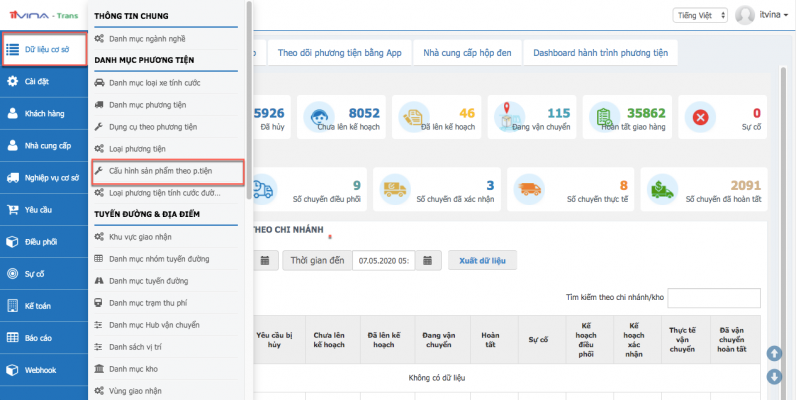 Tại phân hệ Transport, vào “Dữ liệu cơ sở” -> “Cấu hình sản phẩm theo phương tiện”: