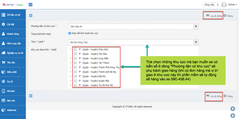 Mục đích: Dùng để phần mềm tự động xếp sẵn các đơn hàng vào xe phụ trách khu vực giao hàng được cấu hình (đây là cài đặt sử dụng cho chức năng điều phối tự động theo khu vực).