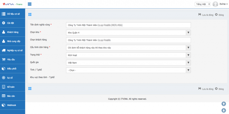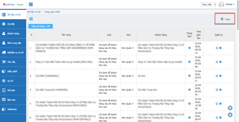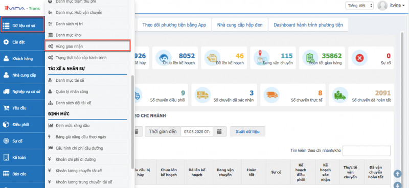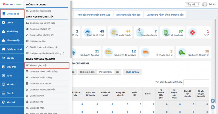 Tại phân hệ Transport, vào “Dữ liệu cơ sở” -> “Vùng giao nhận”:
