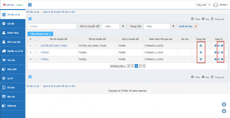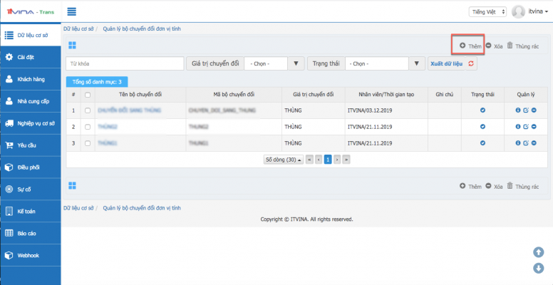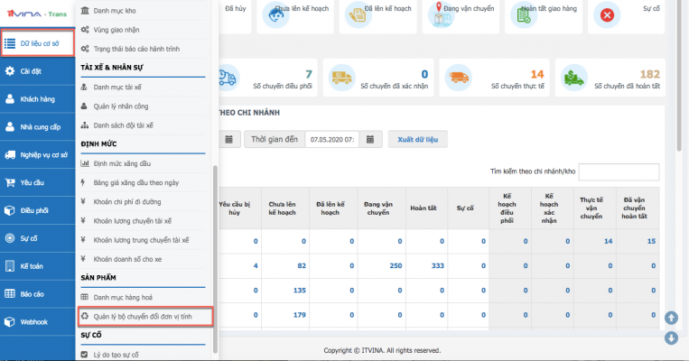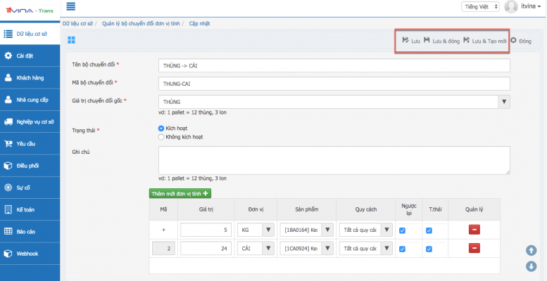 Tại phân hệ Transport, vào “Dữ liệu cơ sở” -> “Quản lý bộ chuyển đổi đơn vị tính”: