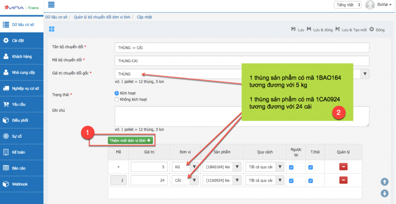 Mục đích: Dùng để cài đặt chuyển đổi đơn vị tính hàng hoá vận chuyển.