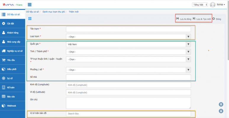 Nhập thông tin trạm thu phí bằng cách nhập thông tin tên trạm, loại trạm sau đó nhập vị trí trên bản đồ để phần mềm tự xác định địa chỉ hoặc nhập thông tin tên trạm, loại trạm sau đó nhập địa chỉ để đánh dấu vị trí trên bản đồ -> Nhấn “Lưu & đóng” hoặc “Lưu & tạo mới”: