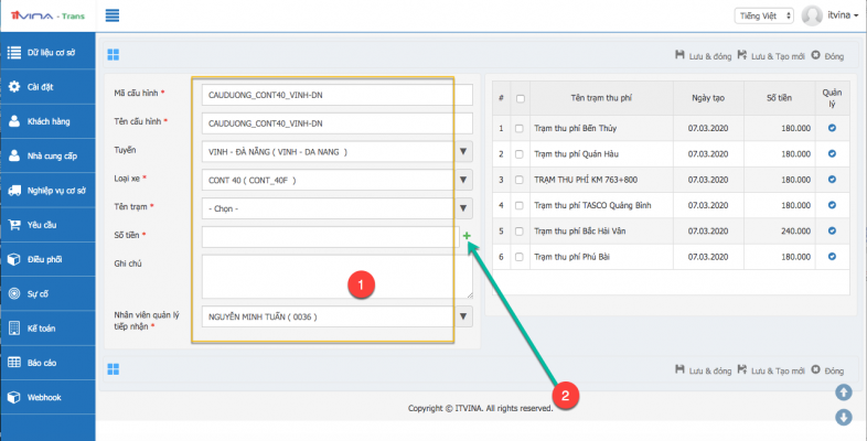Cài đặt phí cầu đường: Cùng lúc có thể cài đặt phí cầu đường của 1 nhóm loại xe ứng với nhiều trạm bằng cách nhập thông tin ở vùng 1 sau đó nhấn vào dấu + ở vùng 2: