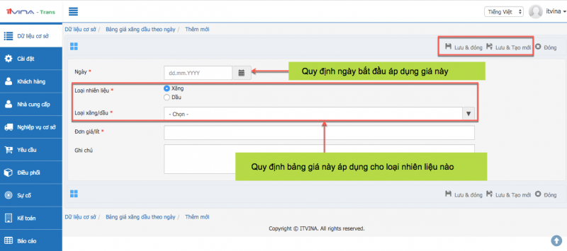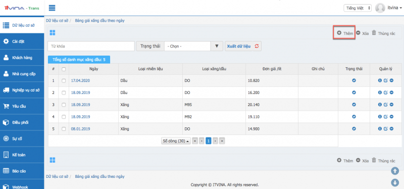 Tại phân hệ Transport, vào “Dữ liệu cơ sở” -> ”Bảng giá xăng dầu theo ngày”: