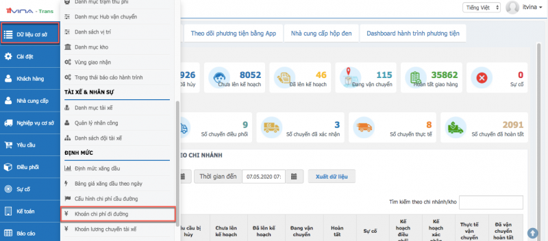 Tại phân hệ Transport, vào “Dữ liệu cơ sở” -> ”Khoán chi phí đi đường”: