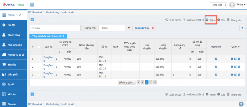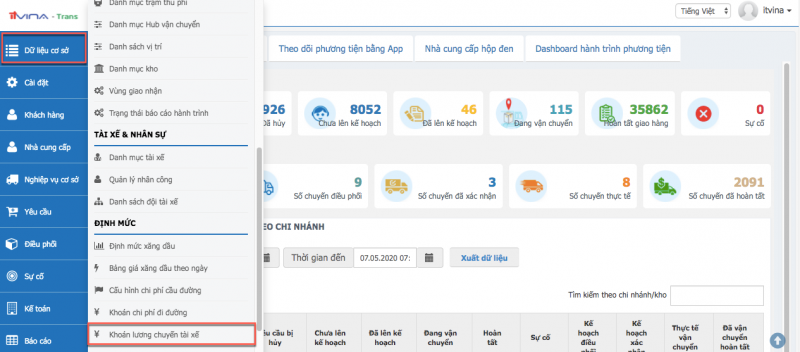 Tại phân hệ Transport, vào “Dữ liệu cơ sở” -> ”Khoán lương chuyến tài xế”: