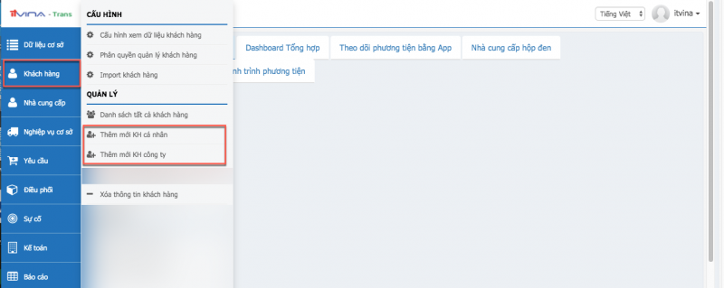 Tại phân hệ Transport, vào “Khách hàng” -> “Thêm KH cá nhân” (nếu khách hàng đó là cá nhân) hoặc “Thêm KH công ty” (nếu khách hàng đó là doanh nghiệp):