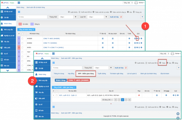 - Đối với các khách hàng có điểm giao, nhận hàng cố định, sau khi hoàn tất thêm khách hàng, bạn nên nhập điểm giao nhận của khách hàng này (tab “NPP – Điểm giao hàng”), điều này sẽ giúp cho quá trình tạo đơn hàng ứng với khách hàng đó nhanh hơn do có sẵn địa chỉ giao nhận. Để nhập thông tin tab “NPP – Điểm giao hàng” (hoặc các thông tin ở tab còn lại), bạn vào “Khách hàng” -> “Danh sách tất cả khách hàng” (hoặc “Danh sách khách hàng”) -> Tỉm kiếm khách hàng đó và nhấn vào xem chi tiết (màn hình 1) -> Sau đó chọn tab ““NPP – Điểm giao hàng” (hoặc các thông tin ở tab khác mà bạn muốn nhập thông tin) -> Nhấn “Thêm”: