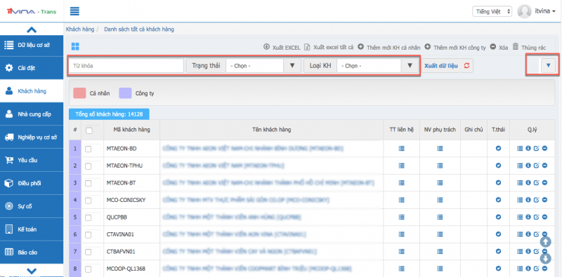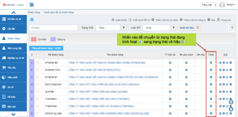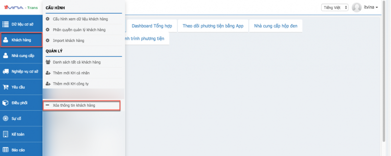 Tại phân hệ Transport, vào “Khách hàng” -> “Xoá thông tin khách hàng”: