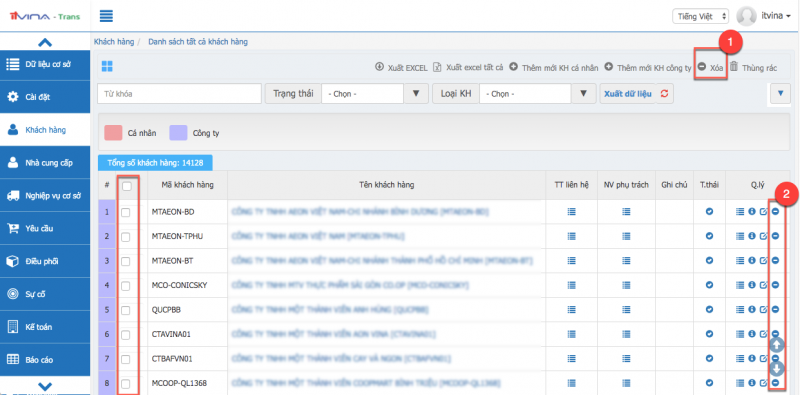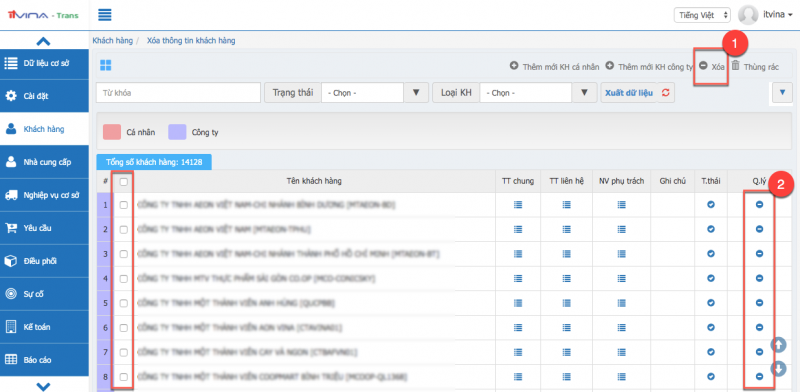 Nhấn vào chức năng xoá từng khách hàng (nhấn vào vị trí 2) hoặc xoá khách hàng hàng loạt bằng cách tick vào các khách hàng muốn xoá và nhấn vào chức năng xoá hàng loạt (nhấn vào vị trí 1):