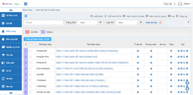 Tại phân hệ Transport, vào “Khách hàng” -> “Danh sách tất cả khách hàng” (hoặc “Danh sách khách hàng”):