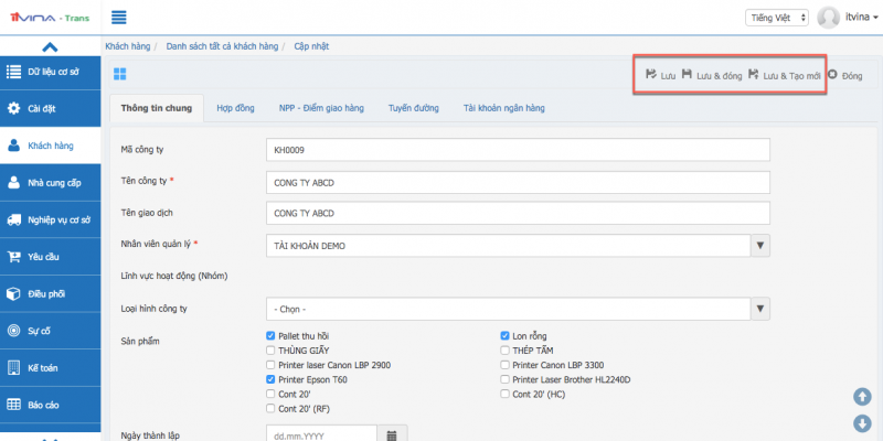 - Các tab thông tin khác của khách hàng như: Hợp đồng; NPP – Điểm giao hàng; Tuyến đường; Tài khoản ngân hàng chỉ có thể được nhập sau khi bạn đã thực hiện xong bước thêm khách hàng.