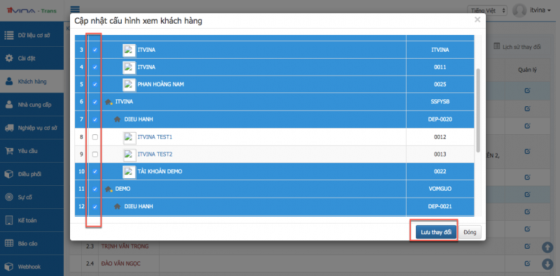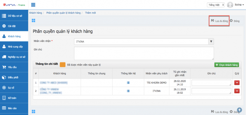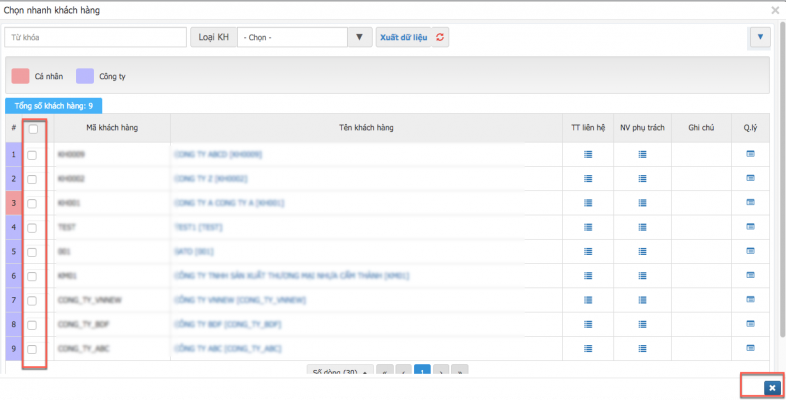 Tick chọn các khách hàng bạn muốn phân quyền cho nhân sự trên quản lý -> Nhấn vào :