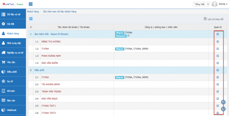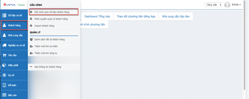 Tại phân hệ Transport, vào “Khách hàng” -> “Cấu hình xem dữ liệu khách hàng”: