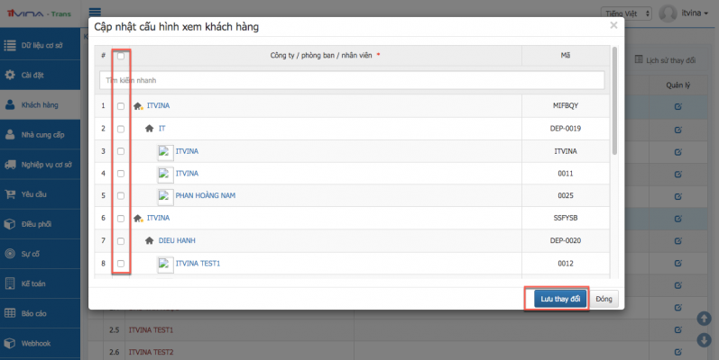 Chọn tên các nhân sự mà bạn muốn người được bạn phân quyền sẽ nhìn được khách hàng của các nhân sự này -> Nhấn “Lưu thay đổi”: