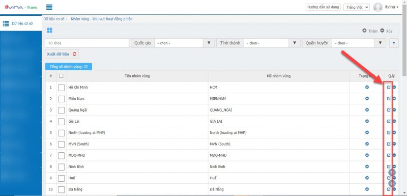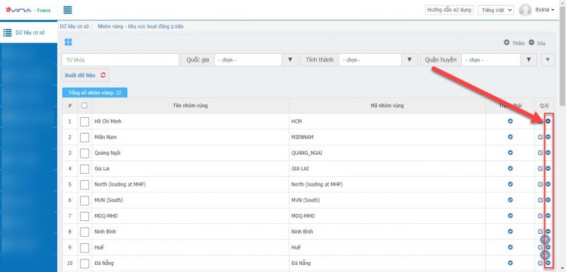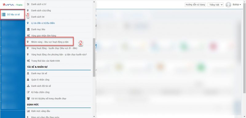 - Tại phân hệ Transport, chọn Dữ liệu cơ sở -> Nhóm vùng – khu vực hoạt động phương tiện