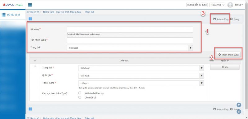 - Điền các thông tin cần thiết có dấu * (1). Phần (2) có thể thêm nhóm vùng tùy ý, sau đó thao tác chọn Quốc Gia (Mặc định là Việt Nam), Tỉnh/ T. Phố. Cuối cùng sau khi hoàn tất thêm nhóm vùng có thể nhấn Lưu & Đóng (3).