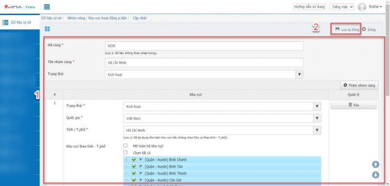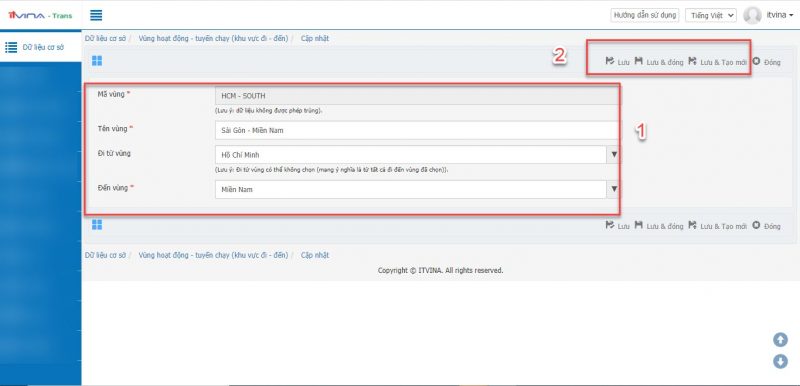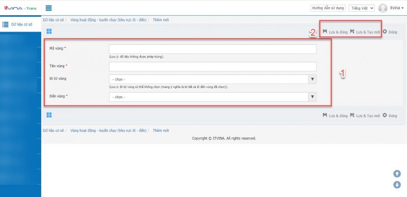 - Điền các thông tin cần thiết (1), sau đó nhấn Lưu & Đóng (2) để kết thúc thêm Vùng hoạt động – tuyến chạy hoặc Lưu & Tạo mới (2) để tiếp tục thêm Vùng hoạt động – tuyến chạy.